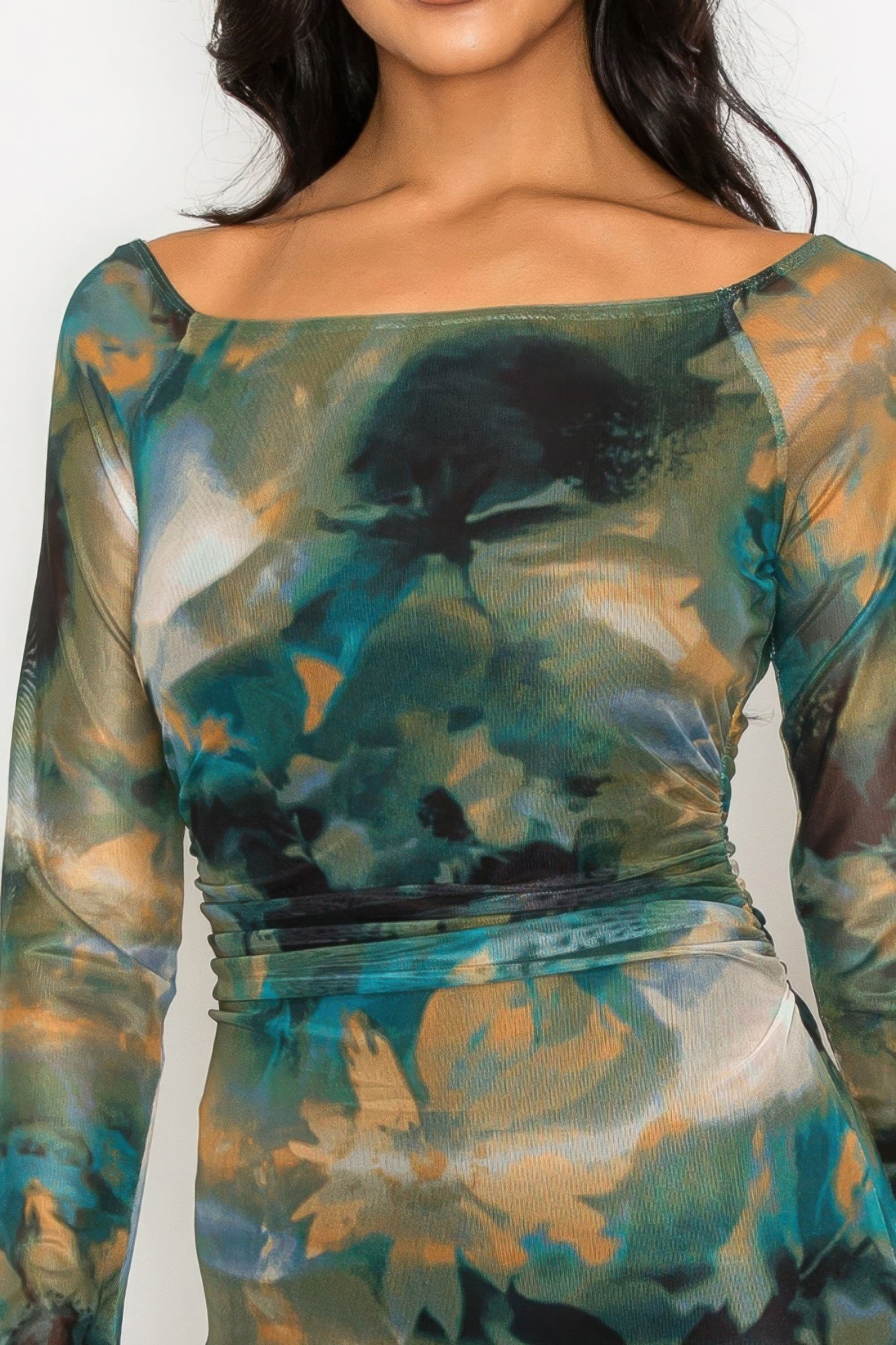 - Comfortable All-Day Wear: Our Slit Off-Shoulder Mesh Printed Dress is tailored for a figure-enhancing fit while maintaining comfort throughout the day.